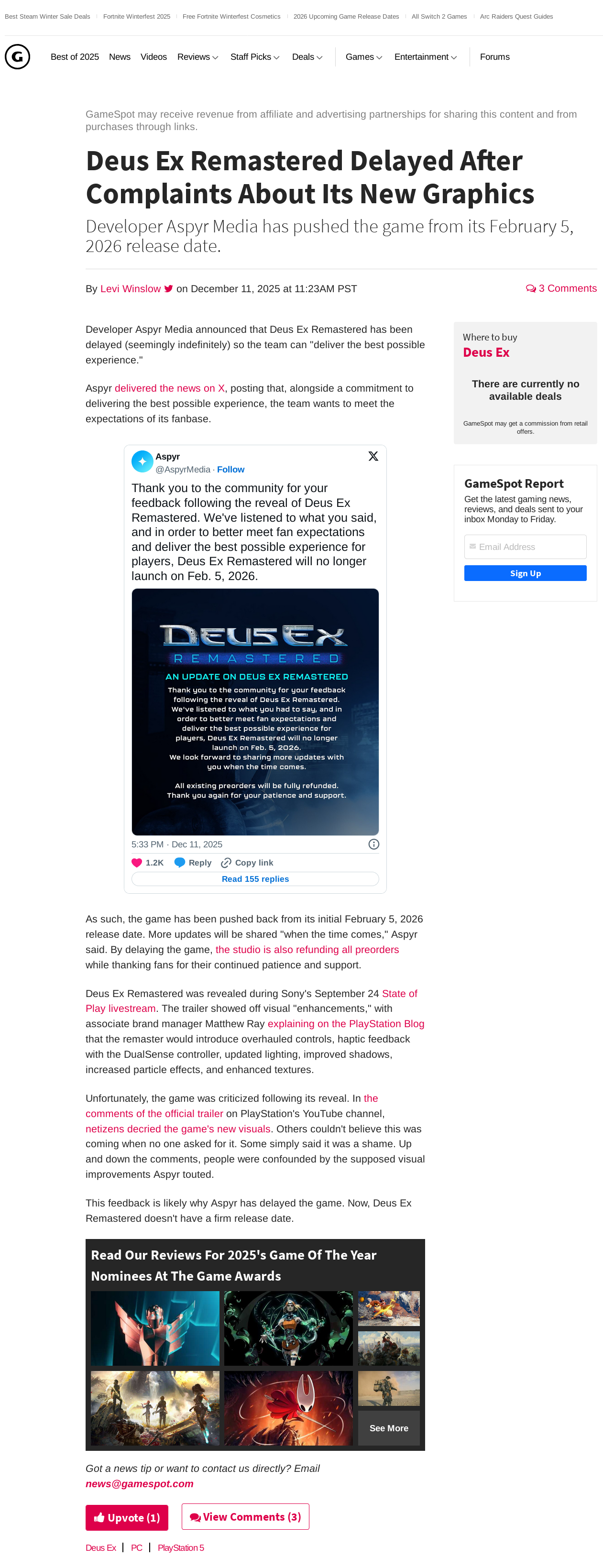 Deus Ex Remastered delayed indefinitely; preorders refunded Anonymous 12/21/25(Sun)04:43:28 No.14298[Reply]