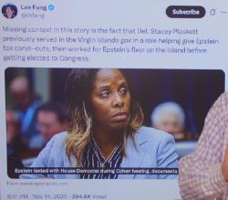 >House Democrat Worked for Epstein's Tax and Political Fixer>Court filings reveal that the Del. Stacey Plaskett, D-V.I., misled the public about her deep ties to the powerful pedophile.