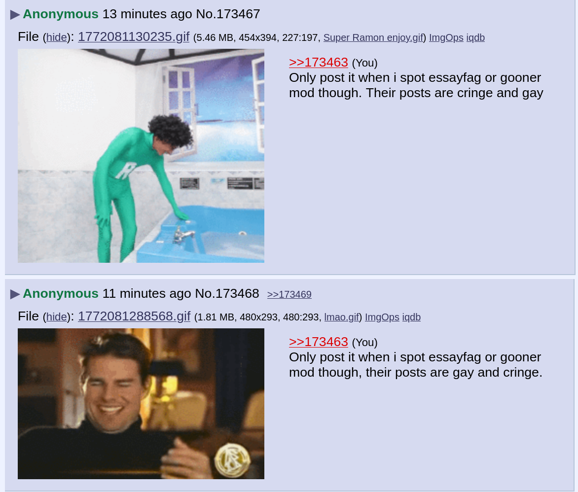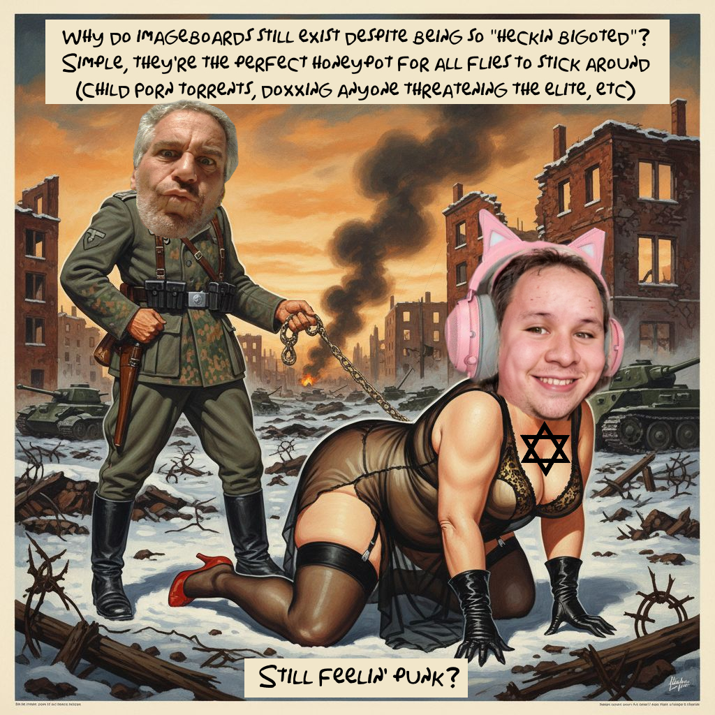 >>173344>Freddit ultimately was one of the same nihilist types like /intl/ that wanted nothing but destruction and csamThis very sentence is why you will never understand what makes an anon what he is. It's all about taking it easy, taking nothing seriously, and laughing at faggots. /pol/edditors like you are so high off your own farts going on and on about muh huwite race (a non-existent fantasy btw), muh huwite ethnoglobe, da joos, da subhumans, da niggurz, and here on tvch, the asshole of the imageboard world, da noozach, playing yourself off as the heroic resistance instead of as the laughable joke that you and your kind represent.