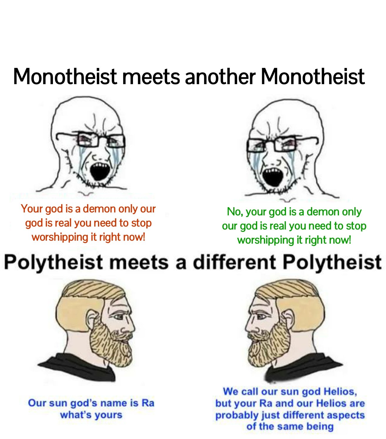 Jews have their own unique style with the silent god and the various laws in numbers and what not, but it was stupid to tie everything together under "monotheism." There are vast differences between Judaism and Islam, and Christianity. Christianity is the cuck religion. It basically forces you to deny everything except death. It is a death cult.