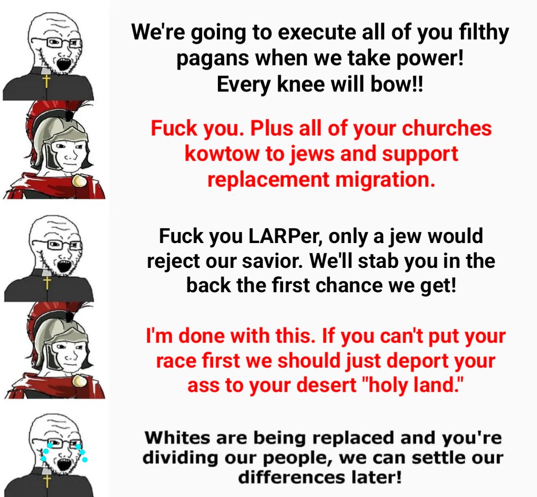 >>164911The way they refer to actually pro-white people as "wignats" is pure projection. It's the Nicksuckers, Latrinos, and civnat mutts who are soft on nigger culture and their "based" groids. It's kind of funny the way them and the BAPtists go after each other when they're both trying to steer people away from proper nationalism.