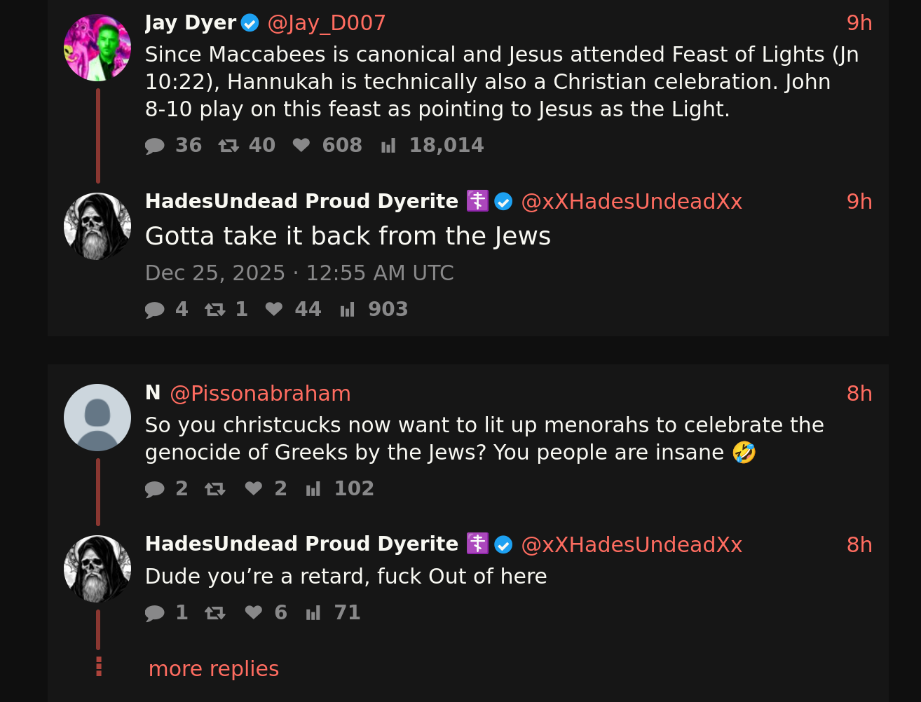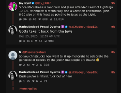 >>164911I use XCancel to check in mainly on people like Aarvoll, the general Adam Green sphere (especially NeedMoreAmalek, who's extremely bitchy but also really knowledgeable about the religious stuff), and a few others to keep up with what's happening. I'm trying to cut back on my Twatter browsing, though, since there's so much demoralizing outrage porn that doesn't do much but put me in a bad mood. The Greenpill stuff especially gets depressing seeing how many people are under the Christfag spell and foam at the mouth at the slightest pushback.