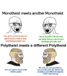 >but it was stupid to tie everything together under "monotheism."The monotheism vs. polytheism dichotomy isn't always as black and white as it's made to be either. Are pagans who worship many gods but also believe in a central higher force of some kind still polytheists? How about those among the ancient Jews who also worshiped angels? Is Trinitarian Christianity polytheistic? I think Jews and Muslims have a point when they bitch about Christians worshiping more than one god.