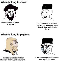 >>154586>Ironically in that the Old Testament is essentially pagan. The Jews are a variant of Paganism. They do not deny the world.The biggest problems are its fanatical Yahweh-onlyism and its legalistic culture. Imagine if the Jews were historically just another group of pagans instead of a bunch of insane zealots who looked down their considerable noses at everyone else. They wouldn't have become the problem population that they are today.