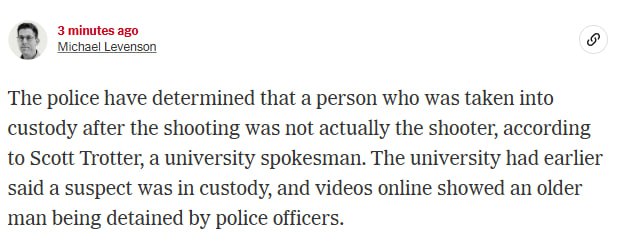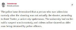 >>162422The police have determined that a person who was taken into custody after the shooting was not actually the shooter, according to Scott Trotter, a university spokesman -