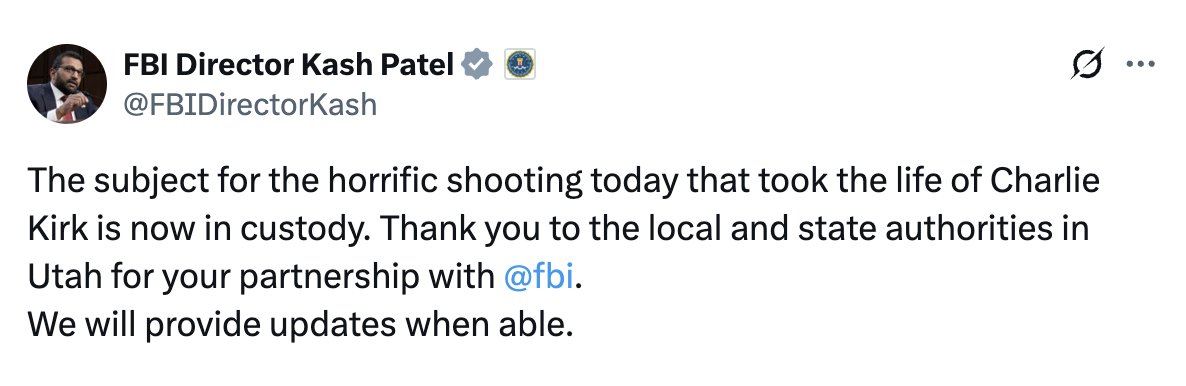 >>162434Utah Speaker Mike Schultz confirms Charlie Kirk has died.