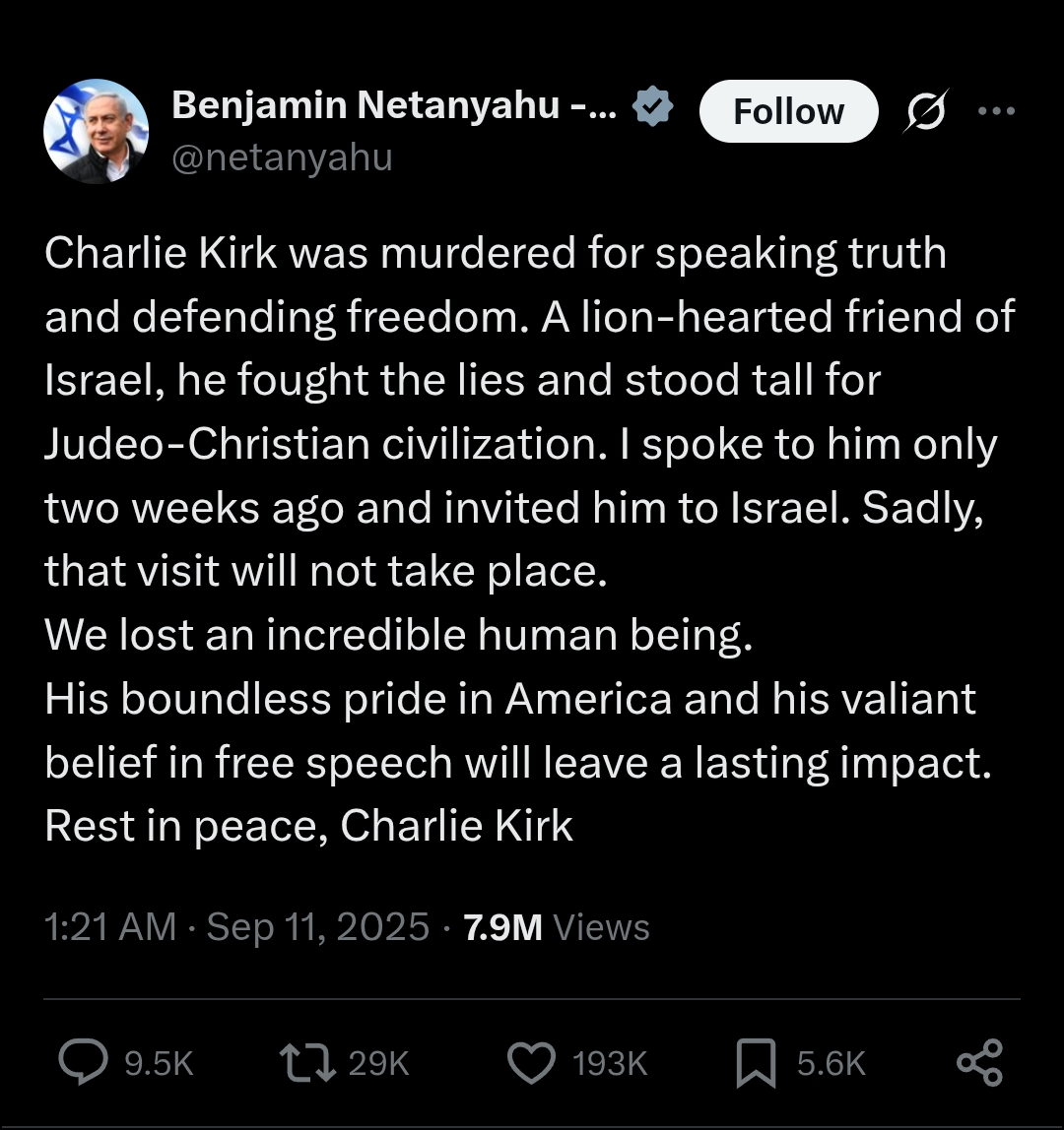https://www.bitchute.com/video/JNIC98kwwr6XBenjamin Netanyahu Via Israeli News Announced That Charlie Kirk Had Been Assassinated 20 Minutes After The Shooting (6:30) How did they know so soon?