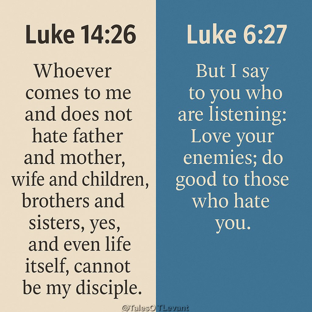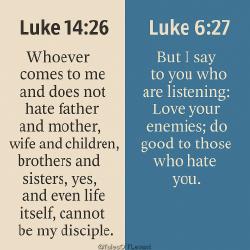 >Does it not say in the sixth chapter of Ephesians to honor your mother and father? Is it not taught repeatedly in the New Testament that we are to love one another, and that he who hates his brother is a murderer? You have no trouble citing all of these other verses, yet somehow you missed those? I mean what I am about to say next in the most polite way possible: what this tells me is that either you do not actually know what you are talking about and are getting all of your information from a dubious source, or you are making a conscious effort to deceive. Either door leads to the end of this discussion.If the Luke verse doesn't literally mean "hate," then theoretically it would still be possible for a Christian to honor their parents (although not to the same extent someone who isn't a slave to Yahweh could). If the Luke verse literally means "hate," then it would be far from the only inconsistency in the Bible. Remember the two conflicting accounts of the death of Judas?