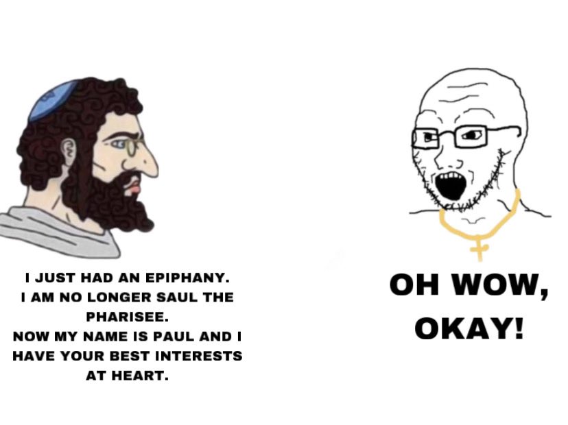 It doesn't matter where a meme came from if its saying the truth, you are simply putting wool upon your eyes and shouting lalala when anons point out the truths about Abrahamic Religions and how paradoxical it is to oppose the enemy of mankind but avow the paradigm that gives them their power over us. Reminder that the Yes Chad