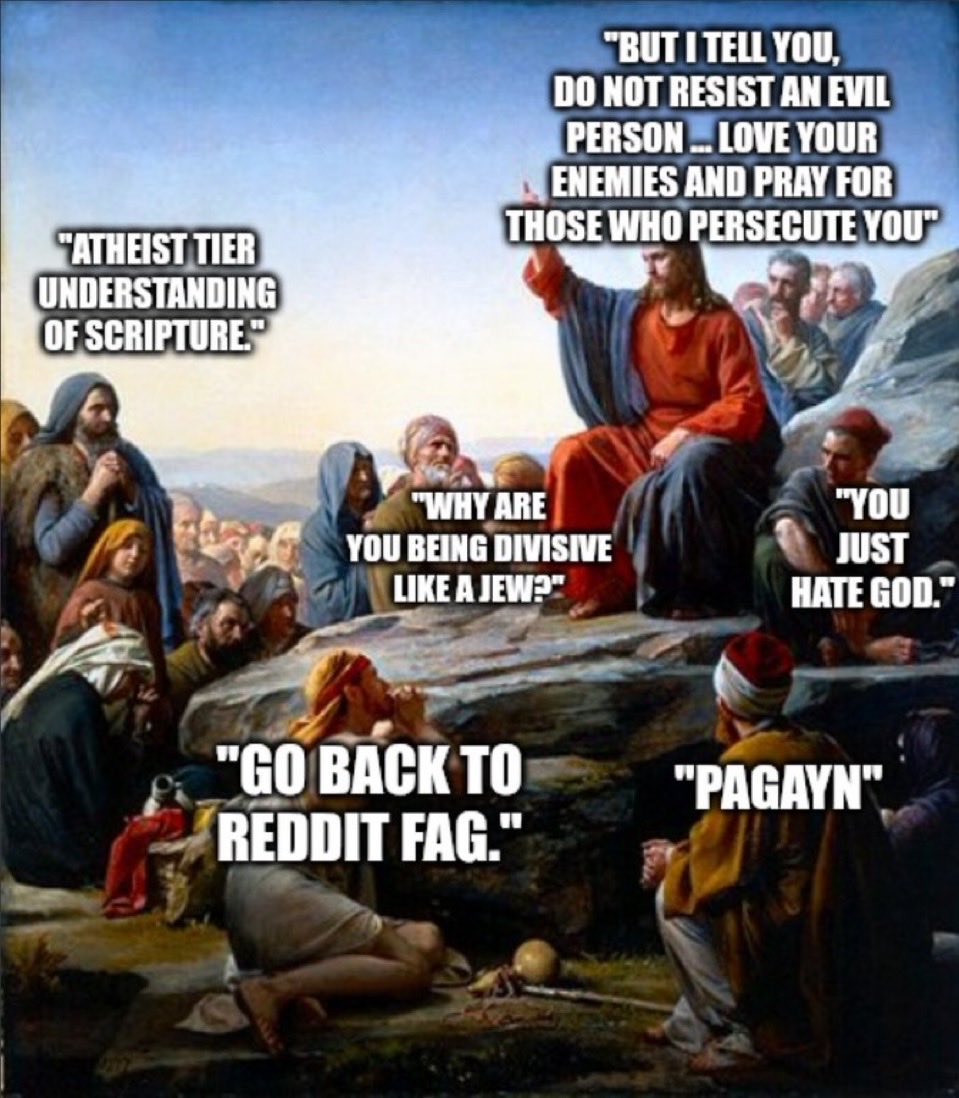 >Does it not say in the sixth chapter of Ephesians to honor your mother and father?>Is it not taught repeatedly in the New Testament that we are to love one another, and that he who hates his brother is a murdererYes this is true, but the bible was written by so many people, the words twisted so many times. Not gonna directly quote it because I don't remember, and I'm not some super scholar. The other anon pointed to multiple quotes showcasing cultish autism on the same level as Stefan Molymeme telling his followers to cut themselves off from their family. Christianity does say to love your enemies, which is paradoxical because your enemies don't love you, and they want you dead. They don't even see you as another human being more often than not because the average person usually has to dehumanize their enemies to butcher them. All I have ever gotten from the bible is mixed messages, I feel like you have a suspended disbelief to try to think there is some sort of puzzle, some sort of true higher meaning to it. I also believe it does have a couple higher meanings, one being Old-school blood and soil Paganism for the Jews,