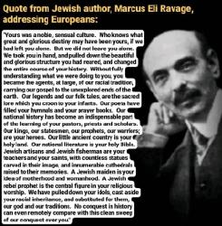 >>165439>everything he says is happening is grounded mostly within realityThe things he says about White culture aren't, he thinks he can btfo White civilization so easily by being a fast-talking brownoid reading a rant which he rehearsed in advance, that's why he's delusional. I'm not even gonna go through and rebut each point because the whole rant is like something you'd hear uttered by a middle-schooler. The key takeaway is that now that they're gloating/declaring victory, the mask has slipped, and they can no longer use the white guilt card on any rational American.