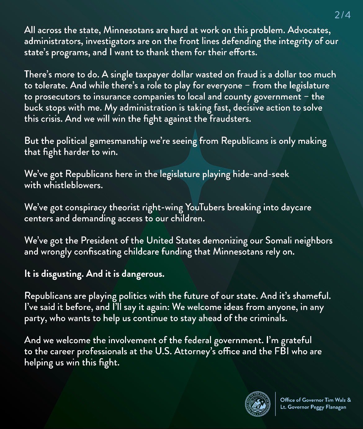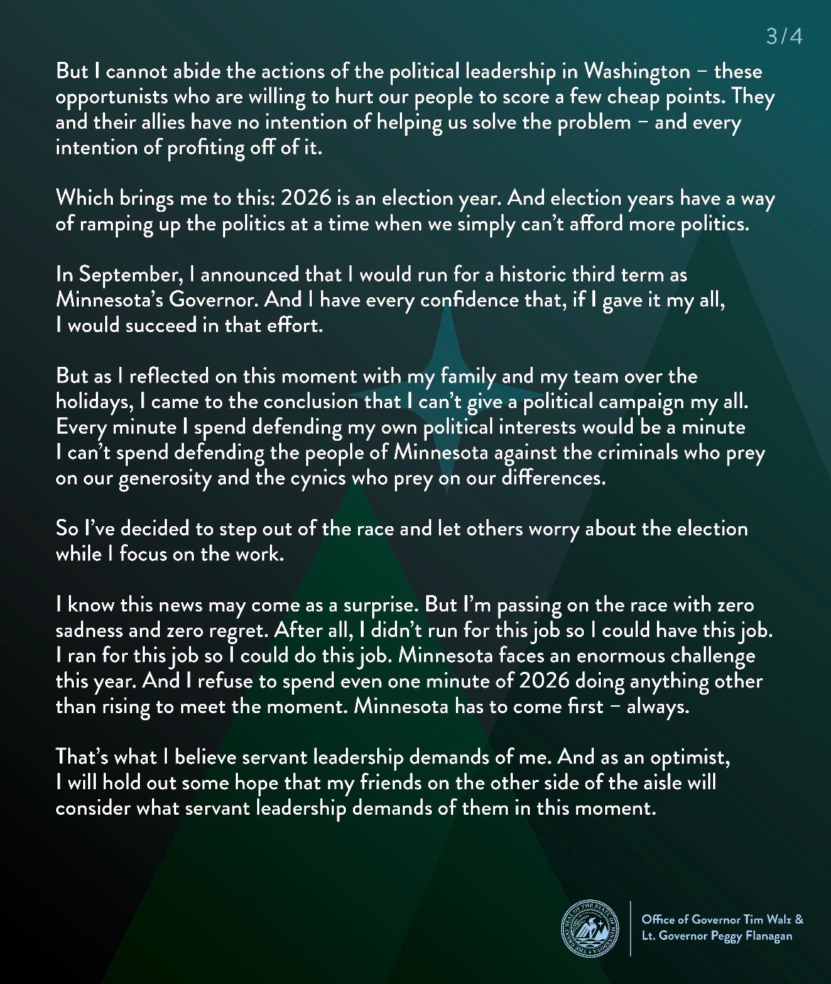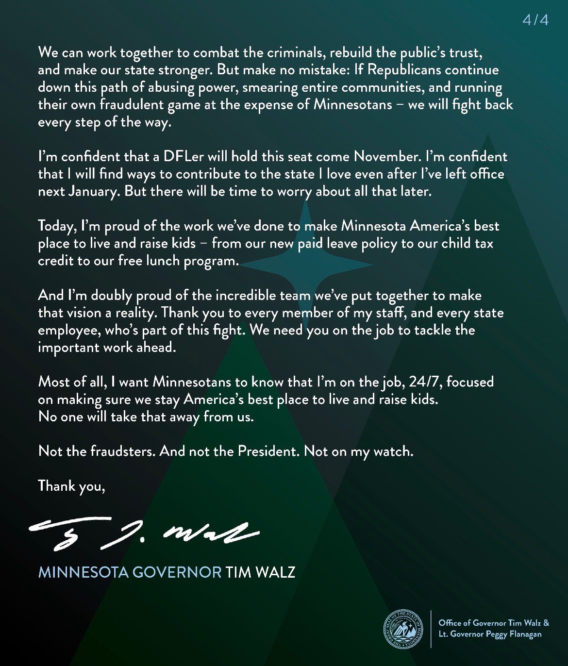 >"Every minute I spend defending my own political interests would be a minute I can't spend defending the people of Minnesota against the criminals who prey on our generosity and the cynics who prey on our differences."