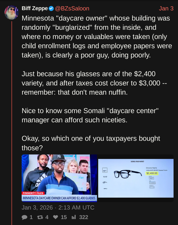 >>166369Walz repeatedly states Minnesota is "America's best place to live and raise kids." By what metric? There are Somalians everywhere and their winters are brutal. Minneapolis has a police force full of Somalians, which is partially why the fraud was allowed to fester to this level, because their in-group loyalty impedes them from policing their own. The Minneapolis mayor is a gay jew who learned how to speak Somali clicks to pander to them.