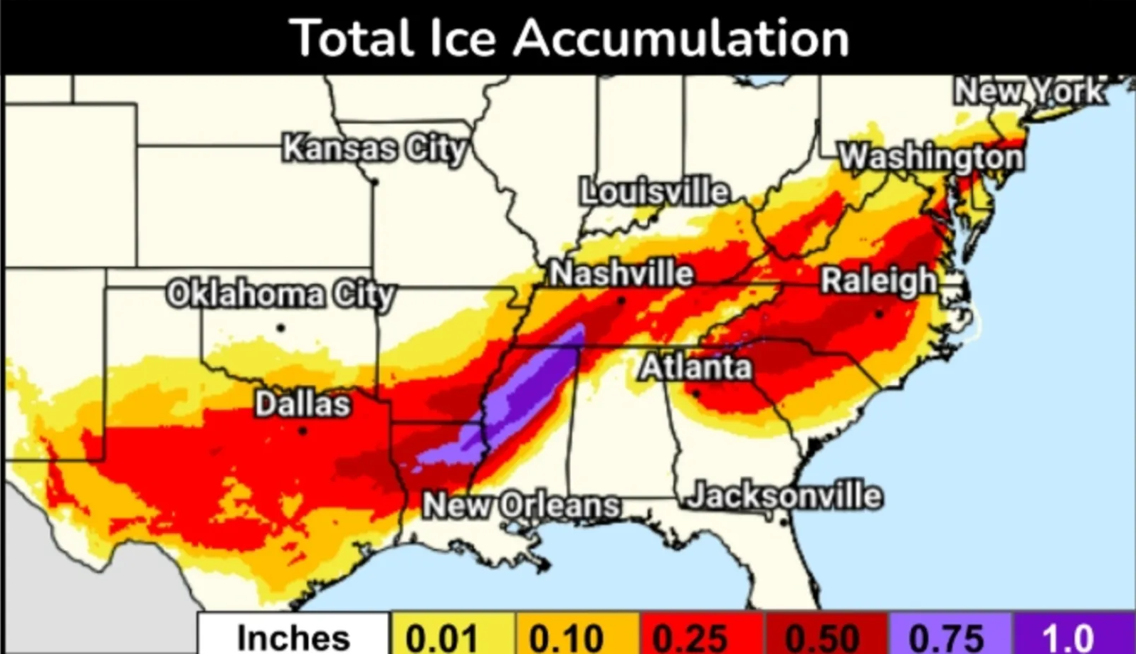 "At 0.25," tree limbs snap and power lines go down. At 0.50"+ (which is possible in the darker purple bands), we are talking about widespread, long-duration power outages and impassable roads," Panovich said. "IMPACTS: WHAT TO EXPECT POWER OUTAGES: This is my biggest concern. With ice accumulating on trees and lines, outages are likely. If you are in the high-risk zones, you need to be prepared to be without power for days, not hours."