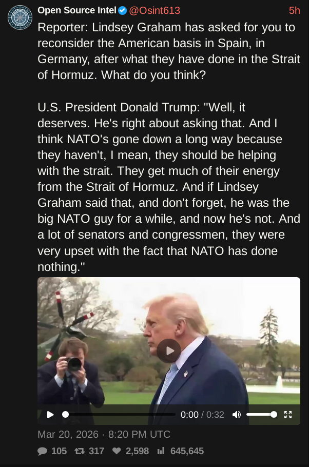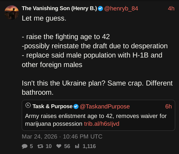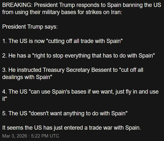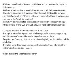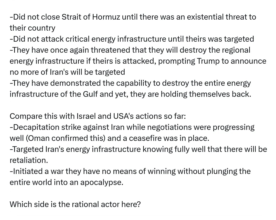 The UK seems like it's heating up, there might be some fun shit happening there in the next few years, as it seems to be not!Zelensky vs pre-Britler is the next election in 2-3 years. If Rupert Lowe is assassinated, I would outright call there and then that the next Reich will be in the UK.China's basically allowed to do whatever it wants now, and while chipset manufacturing has been moved out of Taiwan, it's still not safe to abandon yet without the West taking a massive hit. The macro-play of the war is to not only not be involved, but to get it done with ASAP, because unlike yesteryears wars, the Chinese are the ones who benefit the most from it being dragged out, not the USA. Russia kinda doesn't give a fuck, they're in a similar backing position to the USA in that they're indirect, but unlike the US, they have no need to hurry up and can take advantageous opportunities - both in Iran, and in Ukraine (which is now basically abandoned, or soon-to-be abandoned for the wolves) (unless the UK and France intend on teaching them how to build a nuke + giving them materials, then it's a glass crater courtesy of Medvedev who reeeeeeeeeeeeeally wants to glass Ukraine).