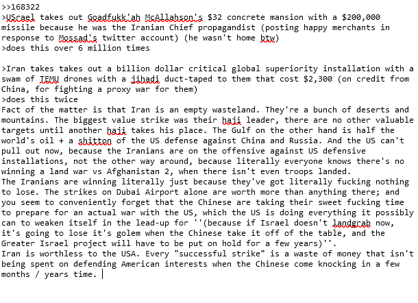 (so the USA is forced to pull in favors from Europe and the UK on behalf of Israeli aggression). The Greenland plan / using the US military to benefit Americans is probably dead in the water to appease the former Europeans, the latter UK is a mixed bag because the UK PM is a total fucking limpwristed faggot retard paki-rapist-defender who can't decide if destroying the UK by selling off it's territories