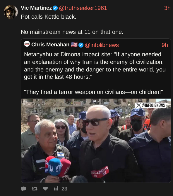>>168081Time to face reality, Ahmed. The Supreme Pizza is no more, along with much of Iran's top leaders. All that's left is what we're seeing, a spergout of firing missiles blindly at civilian targets in every direction, the last gasp of the Islamic regime.
