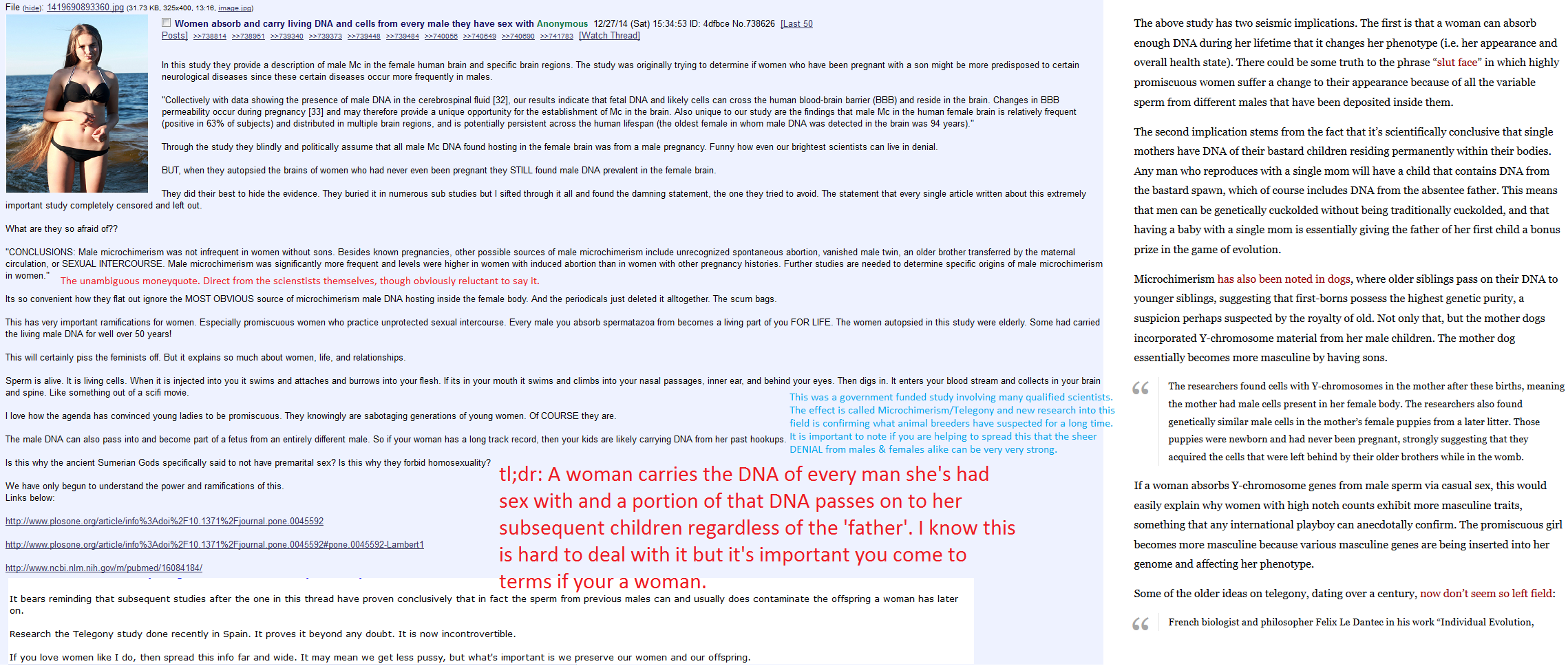 >>370554I remember reading a post back on 8chan, that women absorb the DNA of the semen that gets ejaculated into them, so any child that they may have even with another man, the child will still have some DNA of whoever else ejaculated in their mother. Wish I saved the post.